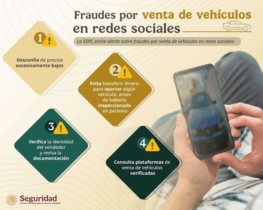 La Secretaría de Seguridad y Protección Ciudadana, a través de la Unidad de Inteligencia, Investigación Cibernética y Operaciones Tecnológicas, emite recomendaciones para evitar que la población sea víctima de estafas o fraudes cibernéticos al realizar la compra de vehículos anunciados en redes sociales.