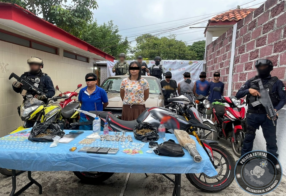 -En San Andrés Tuxtla, elementos de Semar, Ejército Mexicano, GN, Fiscalía y Policía Estatal, así como Policía Municipal detuvieron a tres hombres y dos mujeres, aseguraron 113 envoltorios con diferentes drogas, una bolsa con cristal, dos con marihuana, un radio portátil, una camioneta, cinco motocicletas y un inmueble.