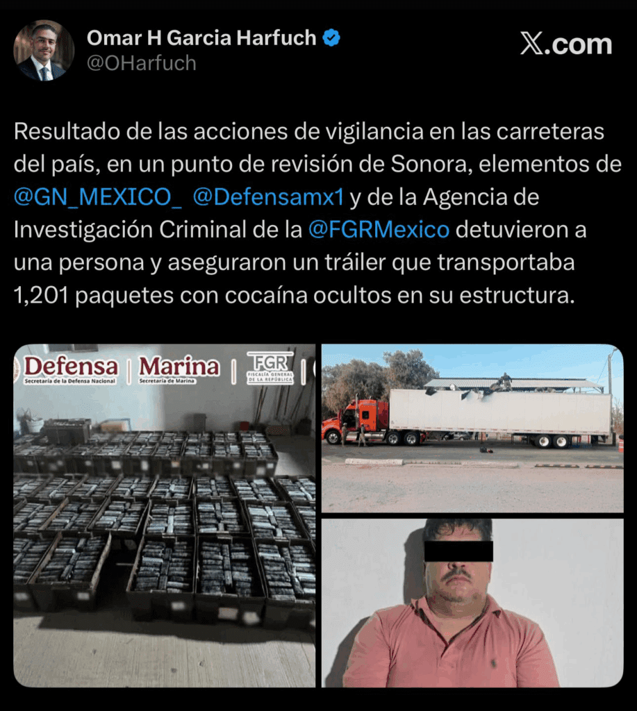 Derivado de labores de inspección y vigilancia para impedir el traslado de sustancias ilícitas en carreteras nacionales, elementos de la Secretaría de la Defensa Nacional (Defensa), Guardia Nacional (GN), Secretaría de Marina (Semar), Fiscalía General de la República (FGR), y Secretaría de Seguridad y Protección Ciudadana (SSPC) aseguraron un cargamento con 1,201 paquetes de posible cocaína y detuvieron al conductor de un tractocamión en Sonora.