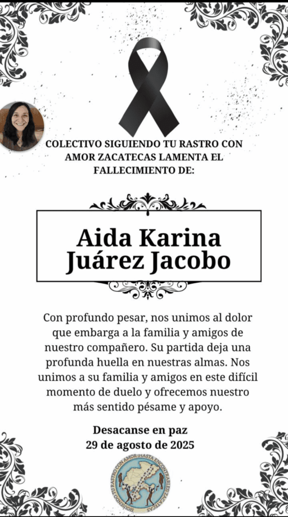 Esta semana también se registró el lamentable homicidio de la madre buscadora Aida Karina Juárez Jacobo en el estado de Zacatecas. Ella buscaba a su hija, Goretty Guadalupe Juárez Jacobo, desaparecida el pasado 25 de junio.