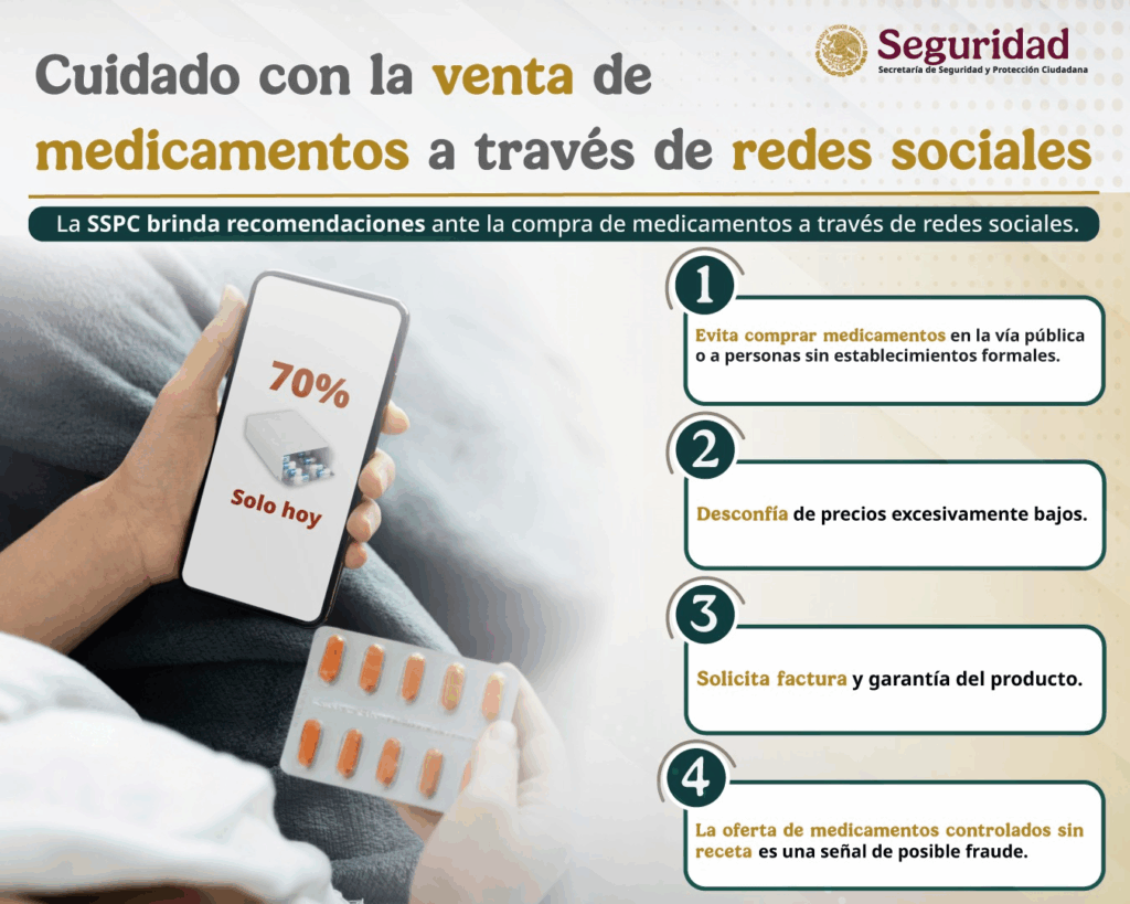 La Secretaría de Seguridad y Protección Ciudadana (SSPC), a través de la Unidad de Inteligencia, Investigación Cibernética y Operaciones Tecnológicas, alerta a la ciudadanía los riesgos de adquirir medicamentos en redes sociales.