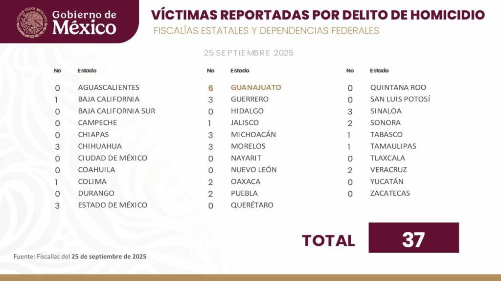 De acuerdo con el reporte diario de homicidios dolosos, el 25 de septiembre se registraron 37 víctimas de homicidio, la cifra más baja en 7 años; periodo que comprende la presente administración y la anterior.
