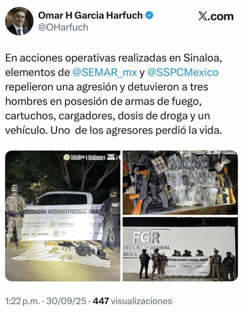 Derivado de las acciones operativas para reforzar la seguridad en el estado de Sinaloa, elementos de la Secretaría de Marina (Semar), Secretaría de Seguridad y Protección Ciudadana (SSPC), junto con Secretaría de la Defensa Nacional (Defensa), Fiscalía General de la Republica (FGR) y Guardia Nacional (GN) detuvieron a tres personas, aseguraron armas de fuego, cartuchos útiles y dosis de droga.