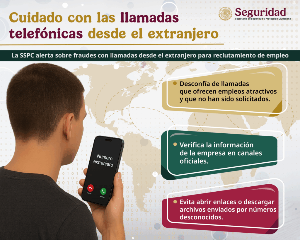 La Secretaría de Seguridad y Protección Ciudadana (SSPC), a través de la Unidad de Inteligencia, Investigación Cibernética y Operaciones Tecnológicas, alerta a la ciudadanía para tomar medidas de seguridad y evitar ser víctima de fraude u otros ciberdelitos con llamadas desde el extranjero sobre reclutamiento para un empleo.
