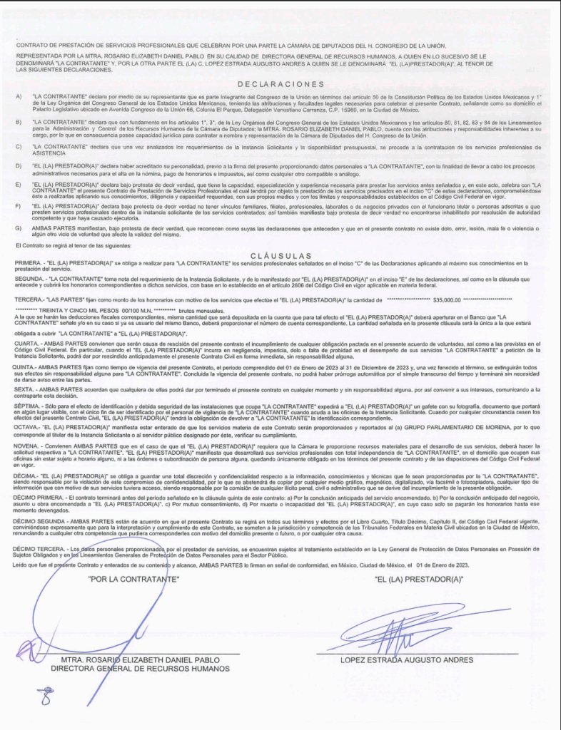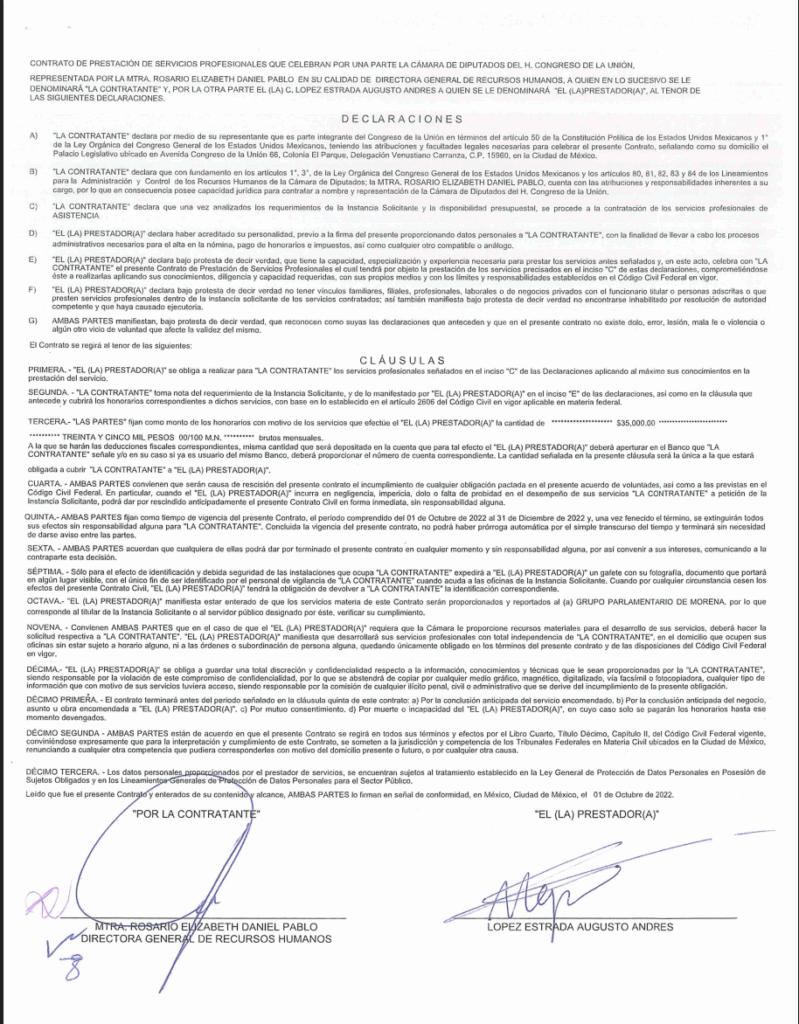La Cámara de Diputados contrató a López Estrada mediante una serie de Contratos de Prestación de Servicios Profesionales consecutivos, con el Grupo Parlamentario de Morena como la instancia solicitante y de reporte.