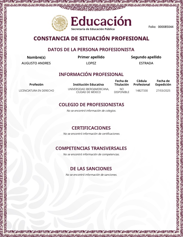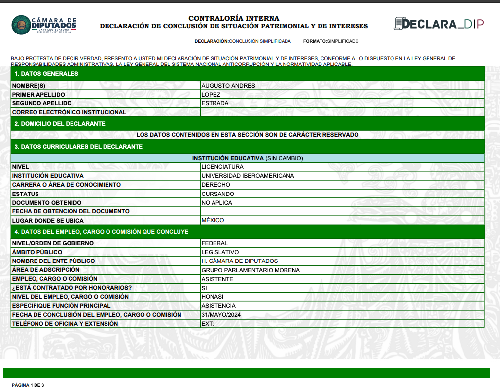 La Declaración de Conclusión de Situación Patrimonial y de Intereses presentada el 31 de mayo de 2024, confirmó que, mientras fungía como “Asistente” por honorarios en el Poder Legislativo, Augusto Andrés López Estrada era estudiante de la carrera de Derecho en la Universidad Iberoamericana con estatus de “Cursando”.