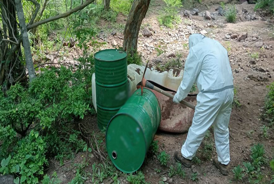 En Culiacán, se localizaron e inhabilitaron tres áreas de concentración de material diverso para la fabricación de drogas sintéticas, se aseguraron 650 litros y 25 kilos de sustancias para la elaboración de metanfetamina. La afectación económica a la delincuencia organizada es de 13 millones de pesos.