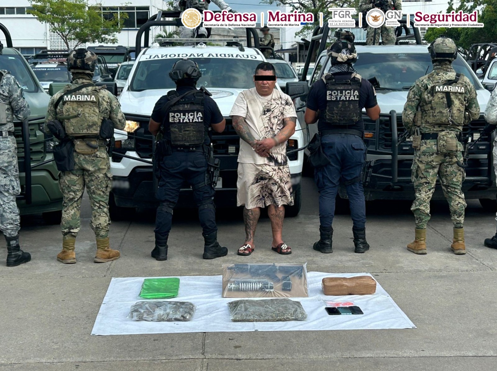 Resultado de las acciones coordinadas para fortalecer la seguridad y la paz en el estado de Tabasco, elementos de la Secretaría de Marina (Semar), Secretaría de Seguridad y Protección Ciudadana (SSPC), Secretaría de la Defensa Nacional (Defensa), Fiscalía General de la República (FGR), Guardia Nacional (GN), Secretaría de Seguridad y Protección Ciudadana (SSyPC) y Fiscalía General del Estado (FGE), ambas de la entidad, detuvieron a Guadalupe “N”, identificado como líder de una célula delictiva que opera en la entidad.