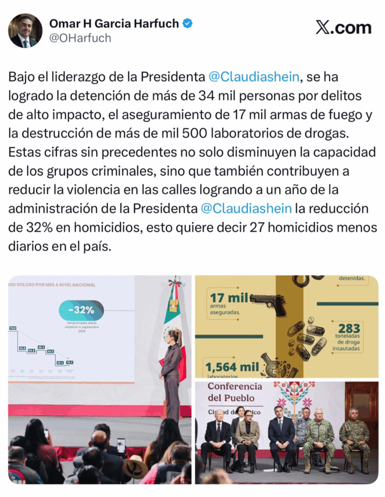 García Harfuch subrayó que los resultados alcanzados reflejan el trabajo conjunto entre la Secretaría de la Defensa Nacional, Secretaría de Marina, Secretaría de Gobernación, Fiscalía General de la República, Guardia Nacional, Centro Nacional de Inteligencia y las autoridades estatales, con acciones que han permitido desarticular redes criminales y afectar sus estructuras financieras.