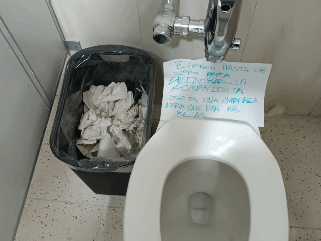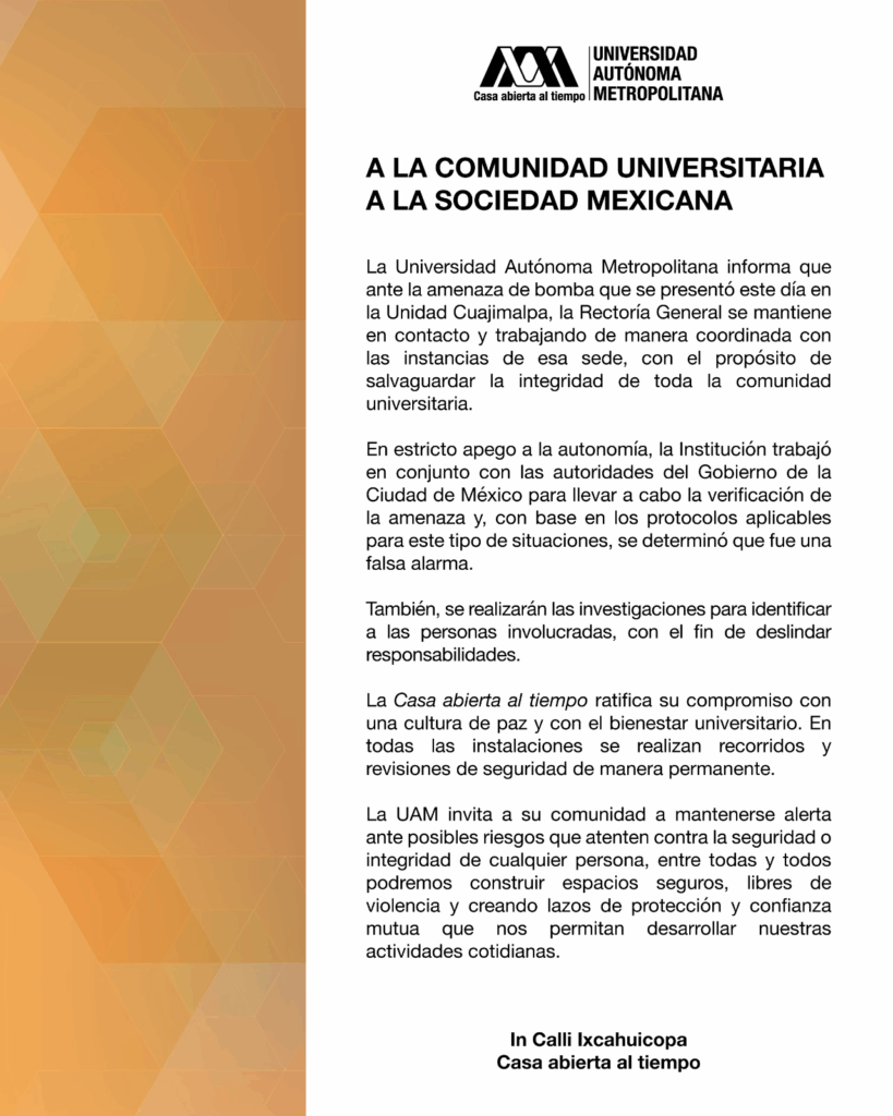 Este lunes 13 de octubre se registró una nueva amenaza de bomba, ahora en la Universidad Autónoma Metropolitana (UAM) plantel Cuajimalpa, donde alrededor de las 14:00 horas fue hallado en los baños el mensaje: “Tienen hasta las 2:00 p.m. para encontrar la bomba oculta. Esta es una amenaza para que den más becas”.