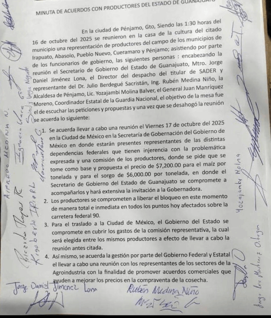 En Guanajuato, después de más de 38 horas, este jueves se liberó el paso por la carretera federal 90, luego de que se anunciara la firma de un acuerdo con representantes del gobierno federal. Este documento fue producto de una negociación realizada en Pénjamo alrededor de la 1 de la mañana del 16 de octubre, donde asistieron funcionarios como el secretario de Gobierno del estado, Jorge Daniel Jiménez; el director del despacho del titular de la Sader, Rubén Medina Niño; la alcaldesa de Pénjamo, Yozajambi Molina Balver; y Juan Manríquez Moreno, coordinador estatal de la Guardia Nacional.