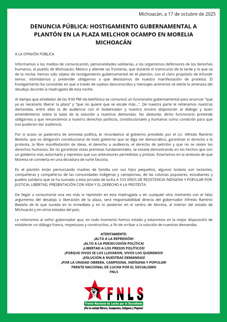 Ante el cuestionamiento de trabajadores de la comunicación sobre los actos represivos contra el FNLS el 12 de octubre en el centro de la ciudad de Morelia, Michoacán, el gobernador Alfredo Ramírez Bedolla, trata de eludir su responsabilidad en el cometido de estos actos represivos, justifica la represión y de manera dolosa pretende desacreditar las necesidades y demandas políticas que motivan nuestra protesta. Con ligereza vierte declaraciones tendientes a la criminalización de la protesta y a desviar la atención del tema central en cuestión.
