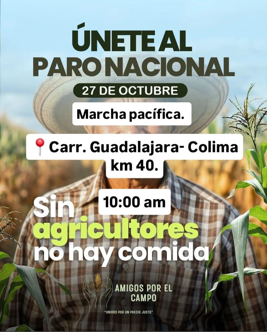 Este viernes, asociaciones y medios de comunicación de agricultores lanzaron una convocatoria a través de redes sociales en la que invitan a productores y campesinos a participar en una marcha pacífica el próximo 27 de octubre, día límite que tiene la Secretaría de Agricultura y Desarrollo Rural (Sader) para responder a la demanda de los productores, quienes exigen un incremento al precio de la tonelada de maíz, así como la eliminación de intermediarios que lucran con los productos del campo, afectando tanto a los productores como a los consumidores.