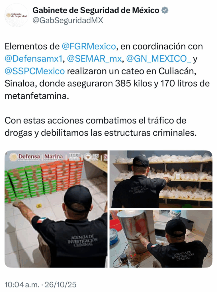 Resultado de trabajos de investigación e inteligencia, en Sinaloa, en una acción encabezada por elementos de la Agencia de Investigación Criminal (AIC) de la Fiscalía General de la República (FGR) junto con Secretaría de Seguridad y Protección Ciudadana (SSPC), Secretaría de la Defensa Nacional (Defensa), Secretaría de Marina (Semar) y Guardia Nacional (GN), se aseguraron 385 kilos y 170 litros de metanfetamina, tras ejecutar una orden de cateo.