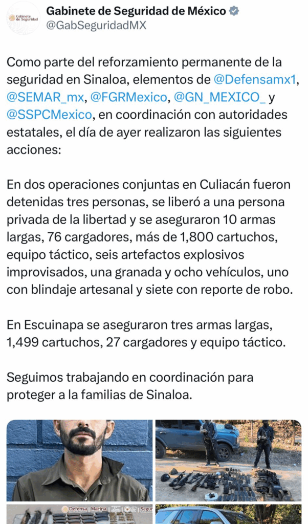 Con estas acciones, las instituciones que integran al Gabinete de Seguridad refrendan su compromiso de trabajar de forma coordinada con autoridades locales para brindar seguridad a la población en el estado de Sinaloa.