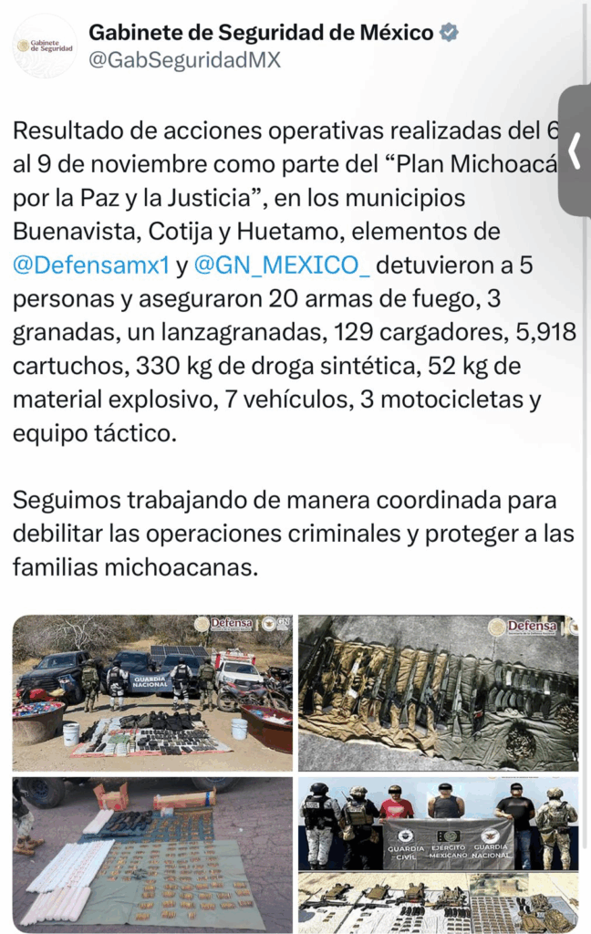 Como parte del “Plan Michoacán por la Paz y la Justicia”, del 06 al 09 de noviembre, elementos de la Secretaría de la Defensa Nacional (Defensa) y Guardia Nacional (GN), en coordinación con la Secretaría de Marina (Semar), Fiscalía General de la República (FGR) y Secretaría de Seguridad y Protección Ciudadana (SSPC), en distintas acciones, detuvieron a cinco personas, aseguraron drogas, armas de fuego, materiales explosivos y vehículos.