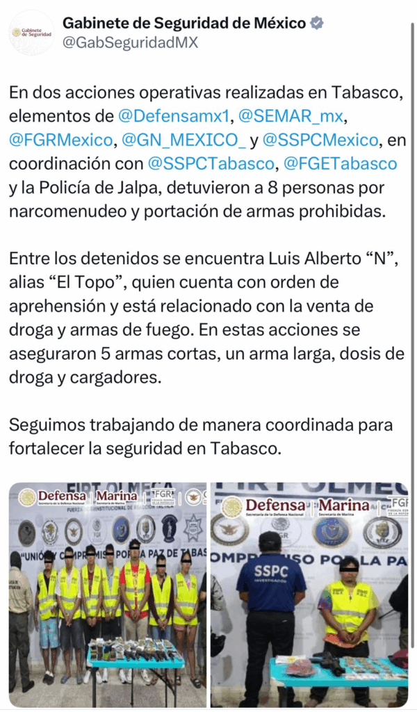 -En Macuspana y Jalpa, elementos de SSPC, Ejército Mexicano, Semar, FGR, GN, Fiscalía y Policía Estatal, junto con Policía Municipal de Jalpa detuvieron a ocho personas, les aseguraron cinco armas cortas, un arma larga, cartuchos, cargadores y diversas dosis de droga.