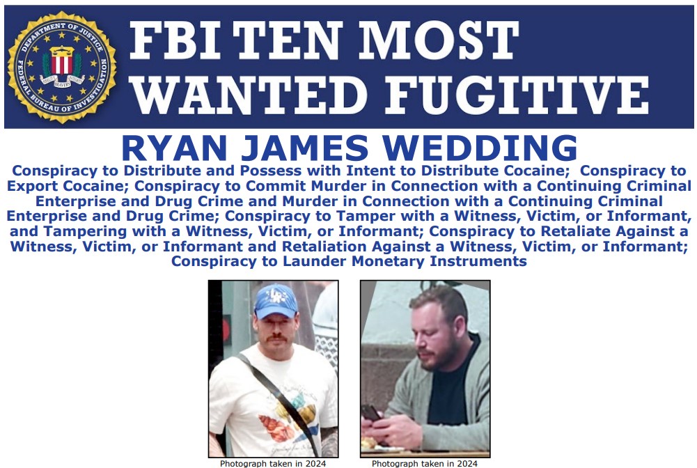 Wedding ya está en la lista de los 10 delincuentes más buscados de USA y se ofrece una recompensa de 15 millones de dólares por información sobre su paradero, es considerado extremadamente peligroso y tiene de cabeza al Jefe de Narcóticos de la oficina de Narcóticos internacionales y aplicación de la ley en el Departamento de Estado, al FBI y a la Fiscal Federal Pamela Bondi.