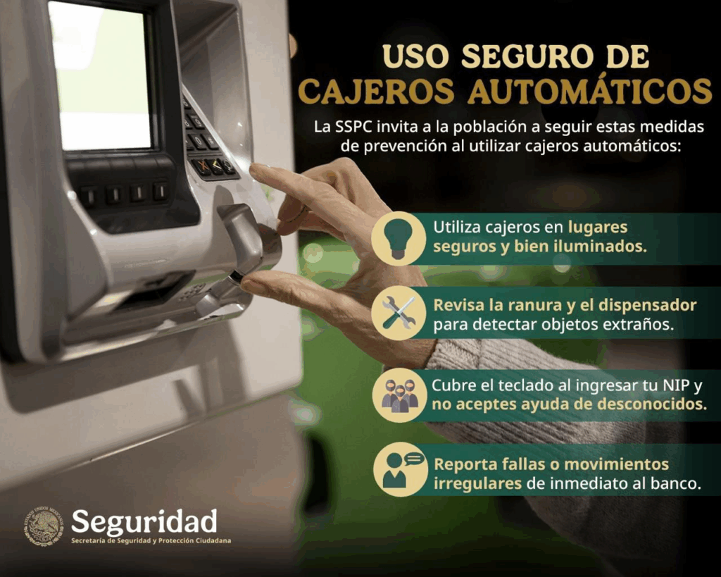 La Secretaría de Seguridad y Protección Ciudadana (SSPC), a través de la Unidad de Inteligencia, Investigación Cibernética y Operaciones Tecnológicas, emite recomendaciones preventivas para evitar ser víctima de fraudes o robos asociados al uso de cajeros automáticos, además de fomentar el autocuidado y promover un uso seguro de estos dispositivos bancarios.