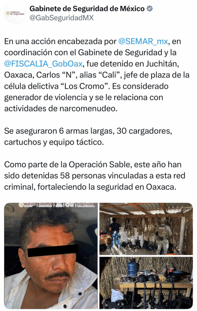 Derivado de trabajos de investigación e inteligencia en el estado de Oaxaca, en una acción encabezada por elementos de la Secretaría de Marina (Semar) junto con Secretaría de la Defensa Nacional (Defensa), Fiscalía General de la República (FGR), Guardia Nacional (GN) y Secretaría de Seguridad y Protección Ciudadana (SSPC) y la Fiscalía General del Estado (FGEO), se ejecutó un cateo en un inmueble ubicado en el Rancho El Llano, en el municipio de Juchitán de Zaragoza, donde fue detenido Carlos “N”, presunto integrante de un grupo delictivo que opera en el municipio.