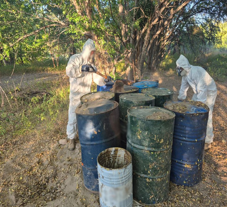 En Culiacán y Cosalá, Sinaloa, en los poblados en los poblados Los Mayos, Corral Viejo, Presa Vinoramas, Bacata, Mezcaltitán, El Tecomate y Las Milpas del Carrizo, elementos del Ejército Mexicano localizaron e inhabilitaron siete áreas de concentración de material diverso, asegurando 5,650 litros de sustancias químicas, un reactor de síntesis orgánica y dos condensadores.