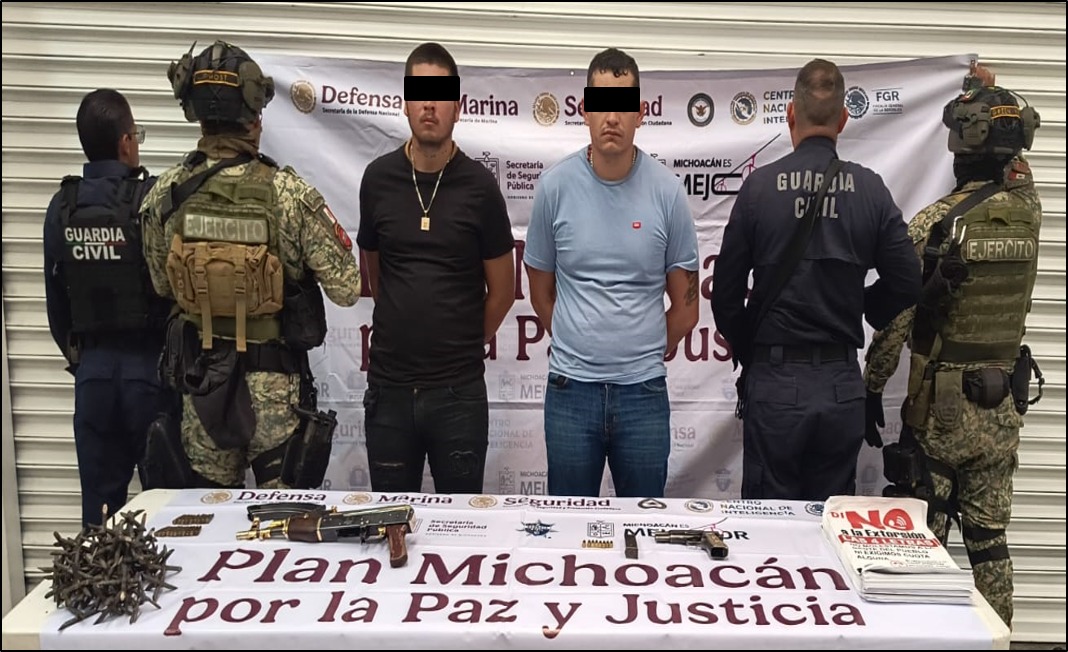 -En Copándaro de Galeana, elementos del Ejército Mexicano y de la Guardia Civil, al realizar patrullajes de vigilancia, detuvieron a dos personas, les aseguraron un arma larga, un arma corta, cargadores, cartuchos, estrellas ponchallantas, hojas con propaganda y un vehículo.