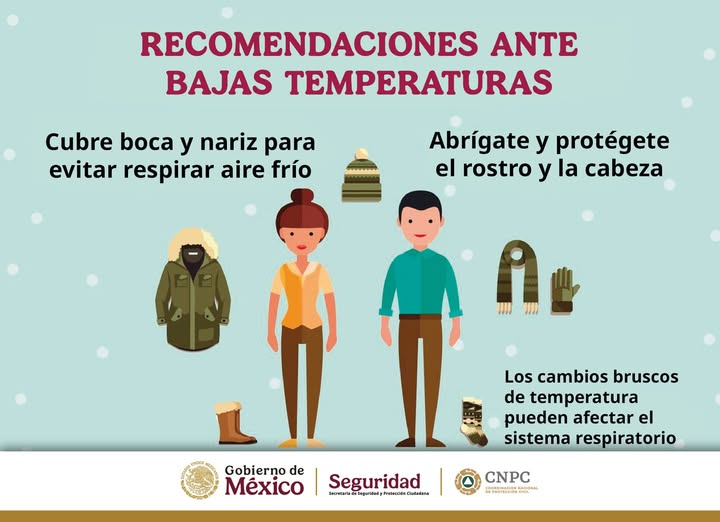 La CNPC exhorta a la población a mantenerse informada a través de fuentes oficiales, extremar precauciones ante lluvias, vientos fuertes y bajas temperaturas, y seguir las recomendaciones de Protección Civil de su localidad.