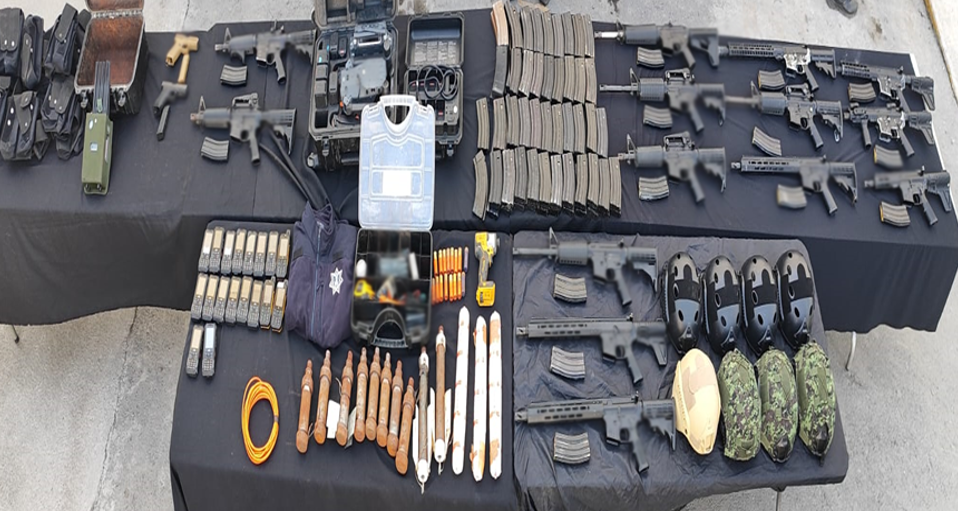 En Navojoa, se aseguraron 21 armas de fuego, 11 cargadores, 146 cartuchos y un vehículo.