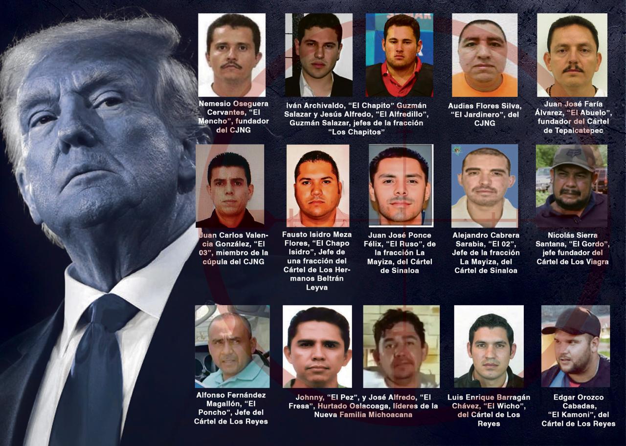 *Son 15 líderes de seis cárteles los narcos por los que vienen las fuerzas federales de Estados Unidos: Nemesio Oseguera Cervantes, “El Mencho”, fundador del CJNG; Iván Archivaldo, “El Chapito”, y Jesús Alfredo, “El Alfredillo”, Guzmán Salazar, jefes de la fracción Los Chapitos, del Cártel de Sinaloa; Audías Flores Silva, “El Jardinero”, del CJNG, y Juan José Faría Álvarez, “El Abuelo”, fundador del Cártel de Tepalcatepec.