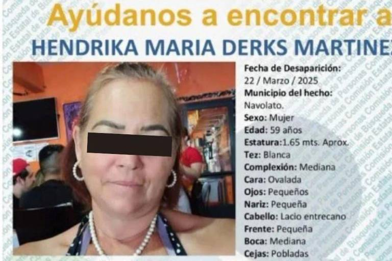 De acuerdo con el periódico Noroeste, el tercer cuerpo localizado pertenece a la exagente policial Hendrika María Derks Martínez, de 59 años, quien desapareció en marzo de 2025, cuando sujetos armados la secuestraron junto a su esposo y tres familiares en la colonia Ampliación Plata.
