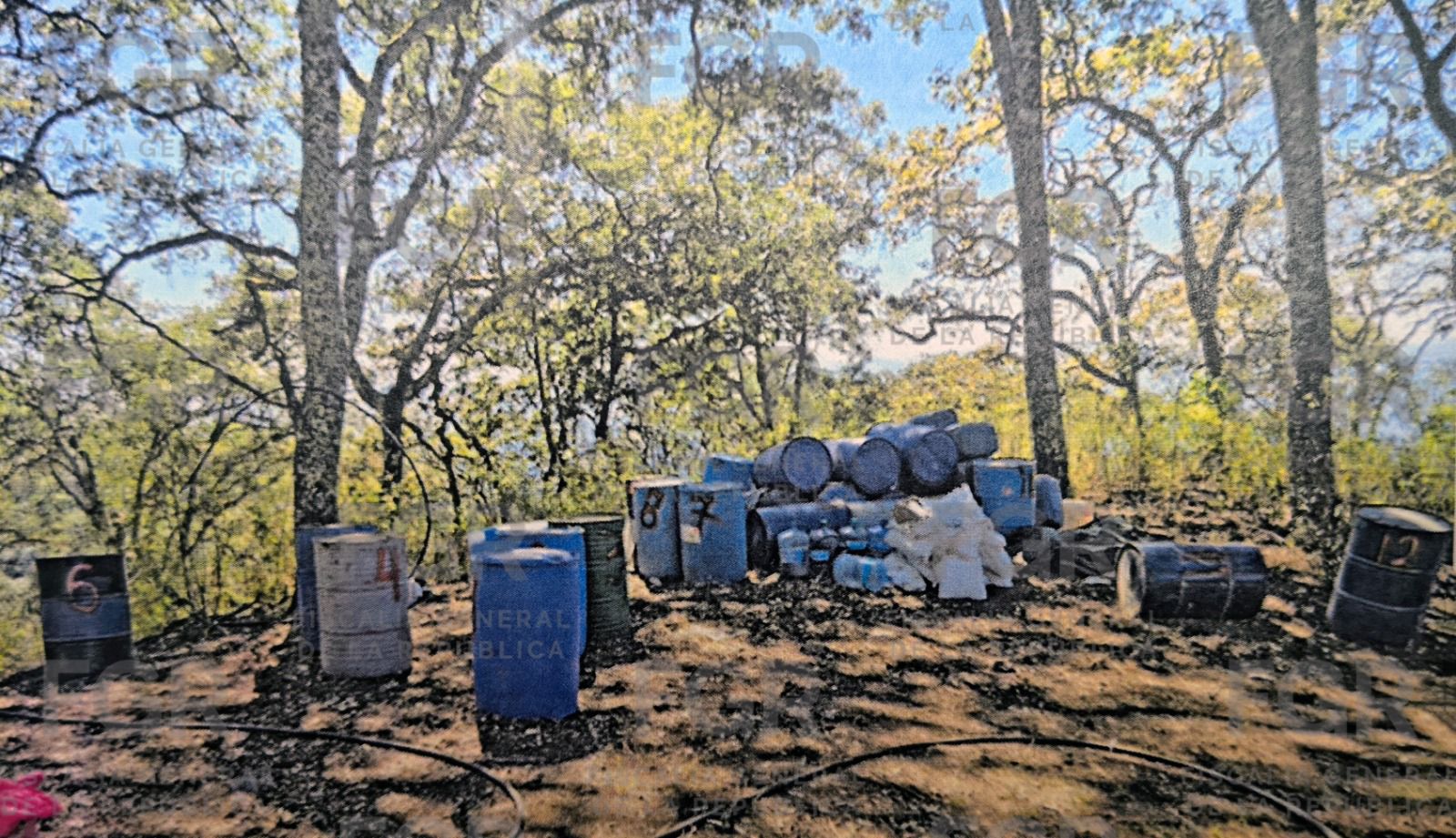 En la acción, coordinada por el Gabinete de Seguridad del Gobierno de México, por conducto de la Secretaría de la Defensa Nacional (Defensa), percibieron un olor a químicos, por lo que se acercaron a inspeccionar la zona; en el lugar, localizaron 15 tanques de gas, 45 recipientes de plástico de diferentes capacidades vacíos, 25 tambos vacíos, 72 bidones vacíos, dos hornos artesanales, un tinaco de mil 100 litros de capacidad vacío, 27 bidones de 20 litros con sustancia líquida y 13 costales de 25 kilos que contenían hidróxido de sodio.