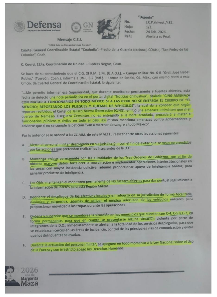 Continúan las repercusiones del CJNG y sus aliados, un documento de las fuerzas militares comisionadas a la Guardia Nacional alerta de ataques sorpresivos, así como quema de vehículos si el cuerpo de Nemesio Oseguera Cervantes no se entregaba.