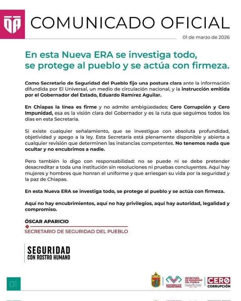 La reacción del gobernador de Chiapas se produjo a través de su cuenta de X, en un mensaje que fue enviado a toda la prensa como una inserción publicitaria. Lo mismo hizo el secretario de Seguridad del Pueblo, Óscar Aparicio. El gobernador fijó su posición y ordenó una investigación: