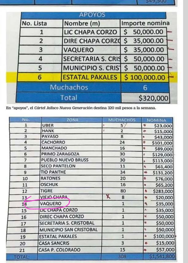 “Entre el 3 y 9 de noviembre del año pasado, la corporación —creada en 2024 por el gobernador chiapaneco Eduardo Ramírez Aguilar— habría recibido 100 mil pesos, según consta en un reporte general de gastos en el que se revela que al Cártel Jalisco Nueva Generación le cuesta casi 2 millones de pesos semanales su operación en el sur de la entidad, donde libra una batalla por el control de las rutas de tráfico de drogas, armas y migrantes con el Cártel de Sinaloa.