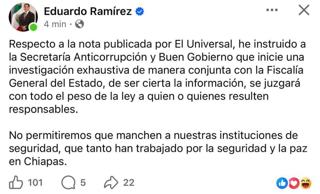 “Respecto a la nota publicada por El Universal, he instruido a la Secretaría Anticorrupción y Buen Gobierno que inicie una investigación exhaustiva de manera conjunta con la Fiscalía General del Estado. De ser cierta la información, se juzgará con todo el peso de la ley a quien o quienes resulten responsables. No permitiremos que manchen a nuestras instituciones de seguridad, que tanto han trabajado por la seguridad y la paz en Chiapas”.