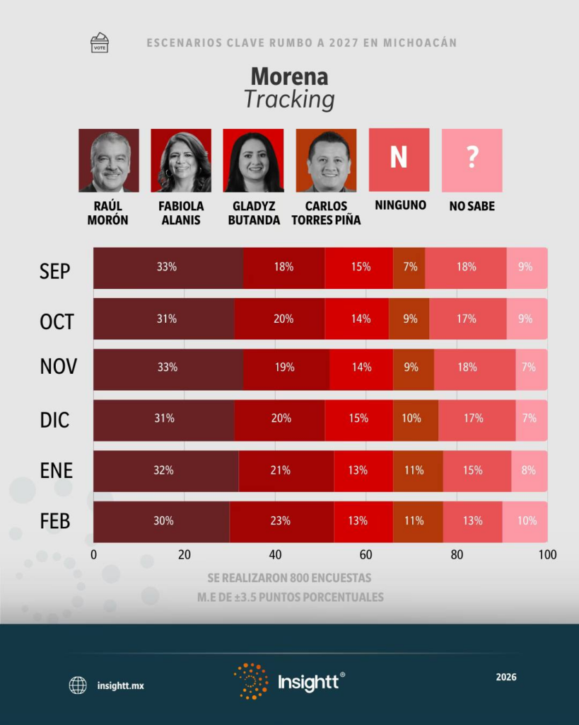 De acuerdo con un sondeo de la consultoría Insightt, realizado a una muestra poblacional de todo el estado de Michoacán, Raúl Morón Orozco estaría con una ventaja de siete puntos sobre su más cercana competidora, Fabiola Alanís, la que se apunta dentro de la contienda por la gubernatura con el 23 por ciento de la intención del voto.
