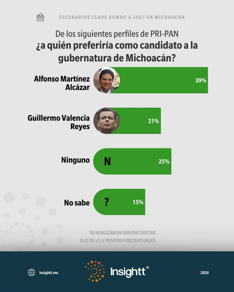 De acuerdo con el sondeo de firma Insightt, Alcalde panista de Morelia, Alfonso Martínez Alcázar, tiene el 39 por ciento de la intención del voto de los que no piensan votar por Morena ni por ninguno de sus candidatos.