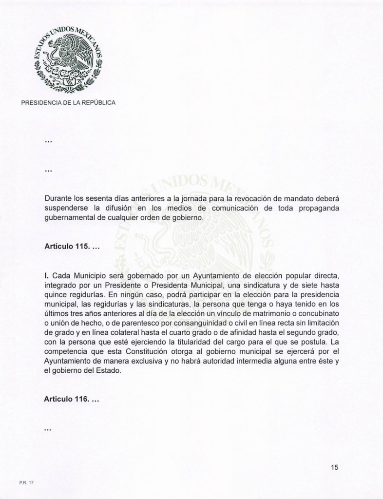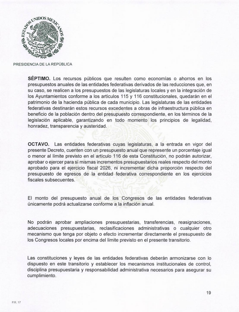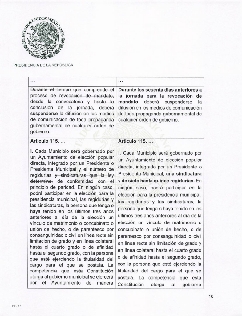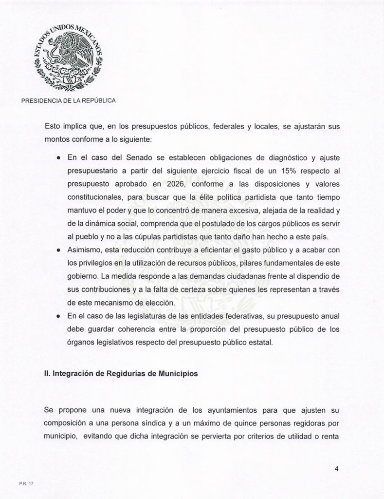 9.- En esta propuesta legislativa, además se buscan ajustes en lo local y democracia participativa. La presidenta apunta también a los estados y municipios. Se busca un recorte de Regidores. Se propone limitar el número de regidores en los ayuntamientos (máximo 15 en ciudades grandes) para evitar “nóminas infladas”.