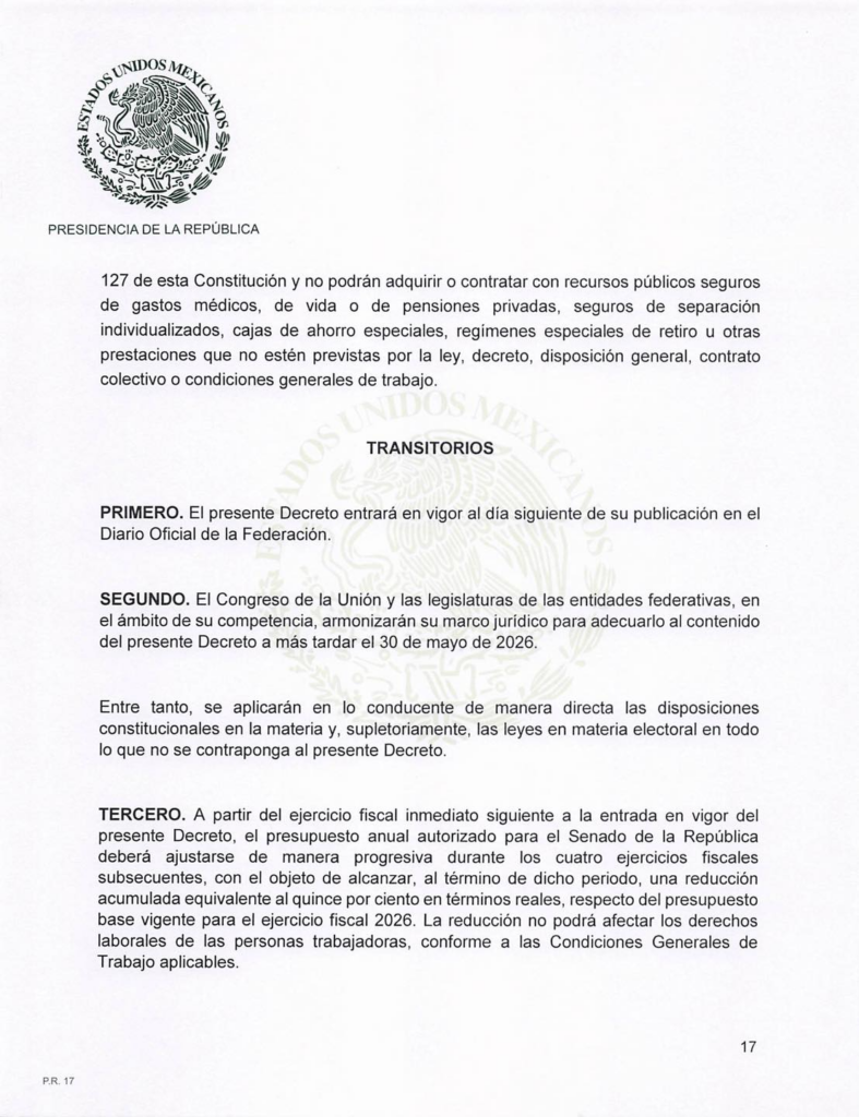 4.- Con relación a la cámara de senadores, se propone una reducción progresiva del 15% en el presupuesto operativo de la Cámara Alta.