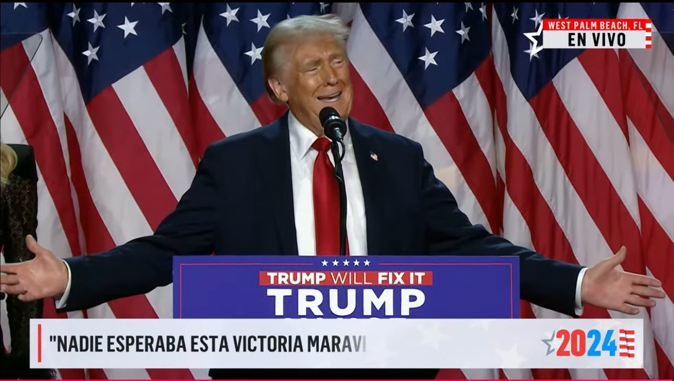 Con el 95% de las actas electorales escrutadas, esta madrugada el vicepresidente Donald Trump se proclamó ganador de las elecciones a la Presidencia de Estados Unidos. Festejó la recuperación del control de la Cámara de Representantes, la ventaja del Partido Republicano en Carolina del Norte, estado clave para ganar; destacó que su campaña fue un movimiento político nunca antes visto, se comprometió a sanear a su nación para regresarle la grandeza que le ha sido arrebatada, recuperándola económicamente y aplicando una dura política de migración, cerrando la frontera sur y deportando el primer día de su mandato a 21 millones de migrantes indocumentados, aplicando la Ley de Enemigos Extranjeros de 1798, lo que podría generar una crisis diplomática en materia económica para México, ya que en los últimos días de poselistismo Trump amenazó a la presidenta Claudia Sheinbaum que de ganar las elecciones aplicaría de 25% a 75% de aranceles a las importanciones mexicanas si no detiene a los criminales y drogas que ingresan a territorio estadounidense