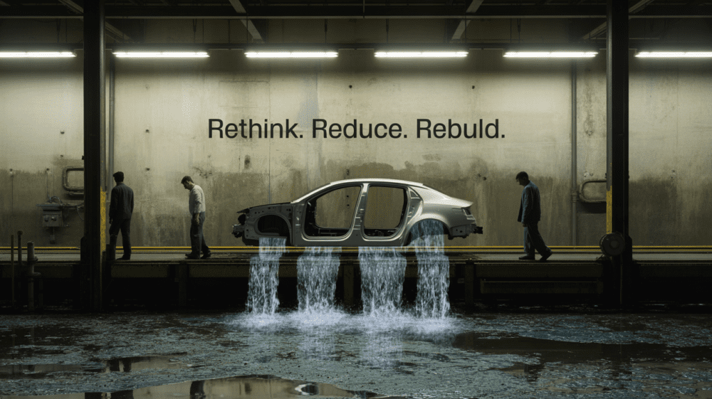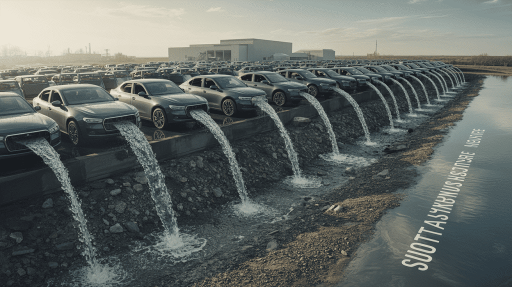 Para la construcción de un auto, desde la elaboración de las piezas hasta su ensamblado y detallado, se requiere en promedio de 148 m3 de agua, que es el mismo líquido que en promedio utilizan durante un año cuatro personas con acceso normal al suministro, y que solo emplean el agua hipotéticamente en actividades domésticas como el consumo, la higiene personal y la limpieza de la casa.